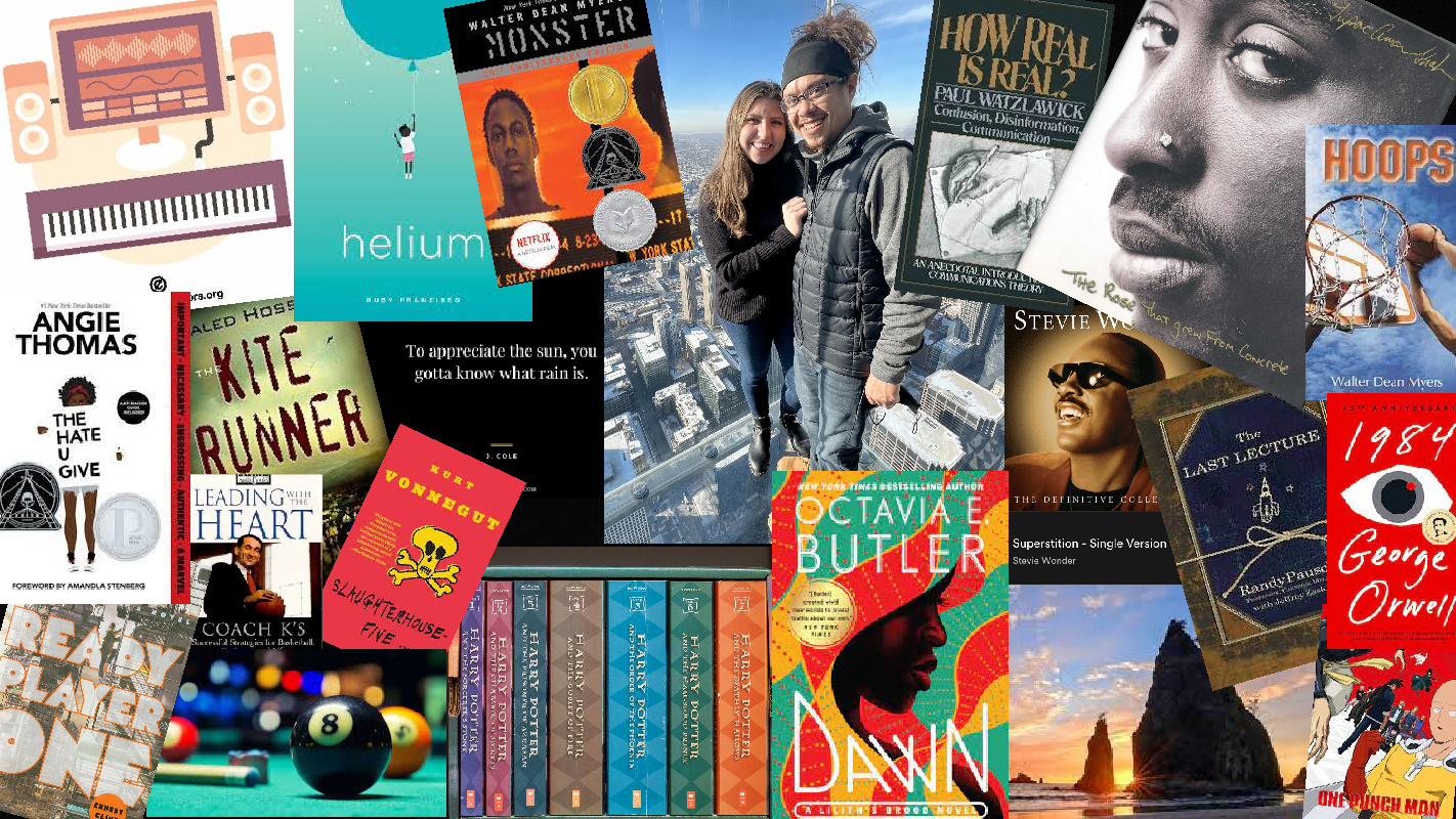 Below is a collage I put together of what I consider to be my own literacy identity. There you will find a photo of my partner and I (I am on the right!) atop the Sears (Willis) Tower in downtown Chicago (one of the many places we love to travel.) As well as works from some of my favorite artists, a few hobbies of mine, and a picture of my favorite place to read; the beach in La Push, Washington, where I visit family every summer!
